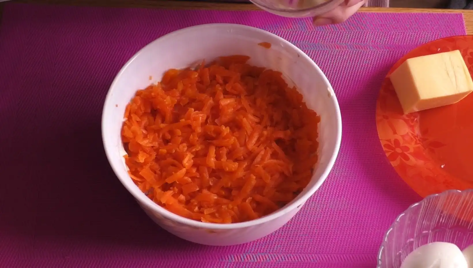 4. Следующий слой будет состоять из протертой на овощетерке отварной моркови, естественно, сдобренной майонезом.