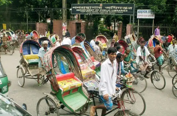 Еще одна особенность местного транспортного сообщения — рикши. Именно из-за них средняя скорость передвижения в городе не превышает 30 км/ч, а на небольших улочках так вообще падает до 10 км/ч. Рикшами пользуются все без исключения. Вообще, увидеть пешего бангладешца — большая редкость. Даже если надо сходить 500 м до магазина за продуктами, бангладешец поедет на рикше.