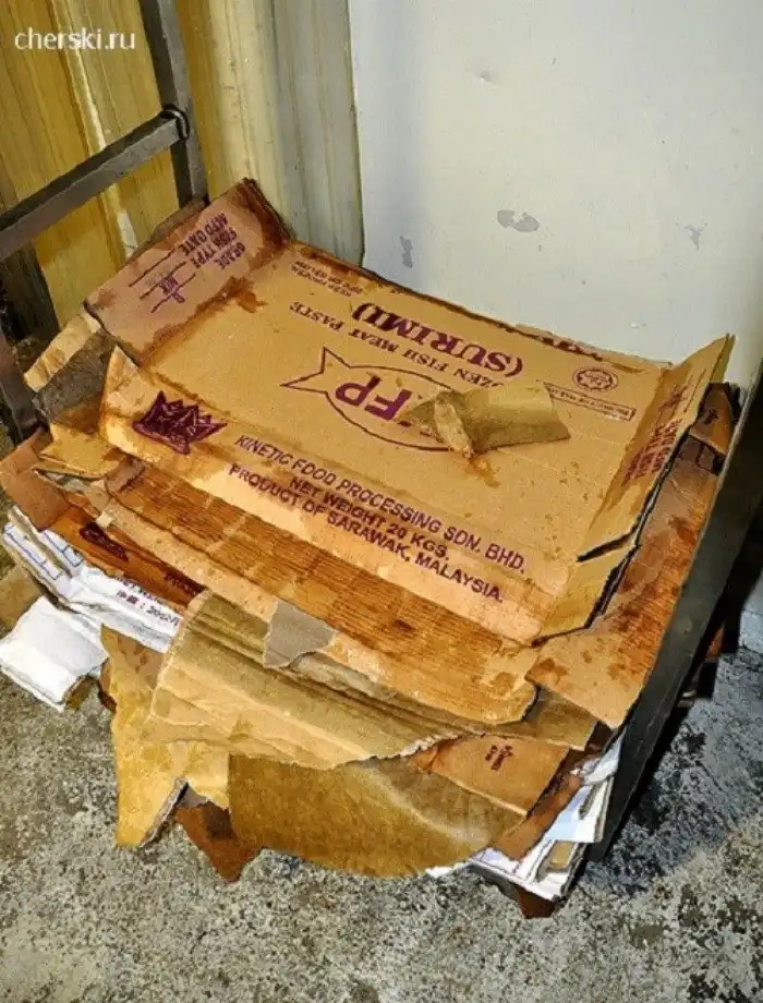 И вот святая святых - склад исходного материала. Я наивно рассчитывал увидеть там живую рыбу. Да, я смешон. Разумеется, эти брикеты в цветных упаковках когда-то являлись рыбой.