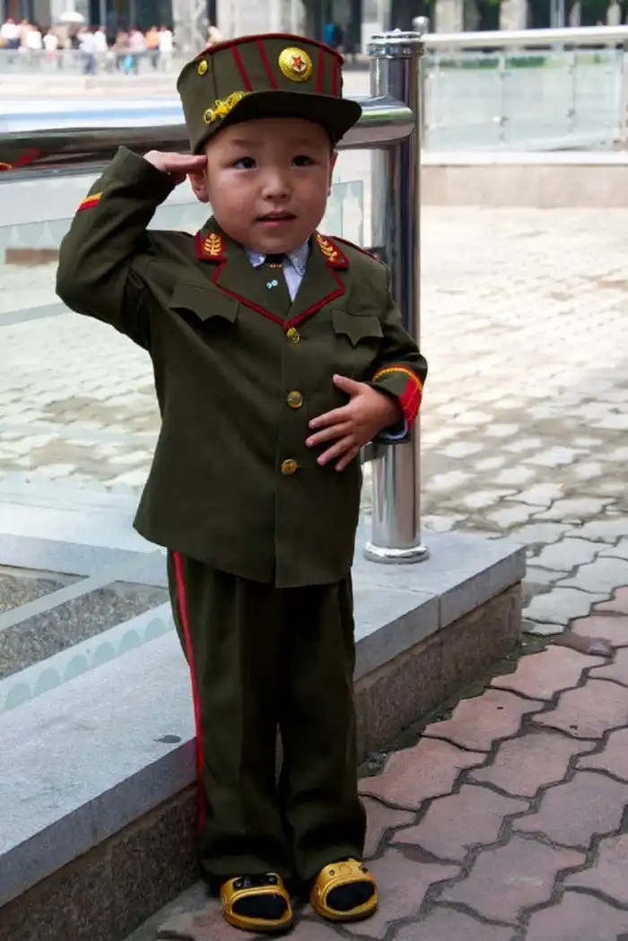 В КНДР каждый обязан отдать долг Родине. На службу в армии призывают не только мужчин, но и женщин. А по выходным даже дети проходят специальную военную подготовку. Во время обучения дети носят такую форму, как на этом мальчике. Срок воинской службы для мужчин составляет 10 лет, для женщин - 3 года.