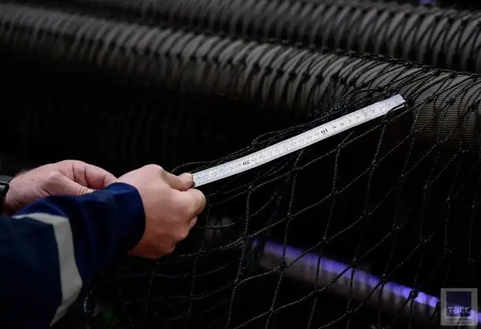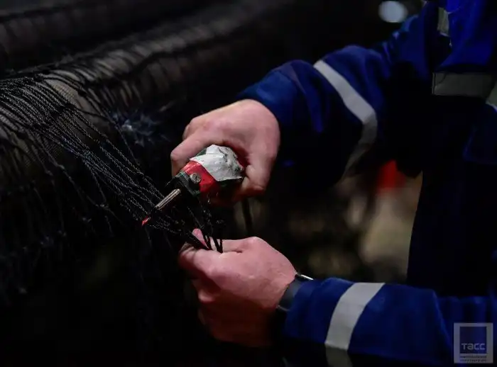 Сотрудники ООО «Приморское Сетевязальное Производство» во время сборки орудия лова для океанического промысла в сетепошивочном цехе на фабрике орудий лова.