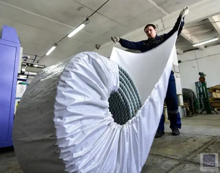 Оператор канатовьющих и веревочных машин в цехе №1 фабрики орудий лова в п.Подъяпольское во время упаковки швартового каната