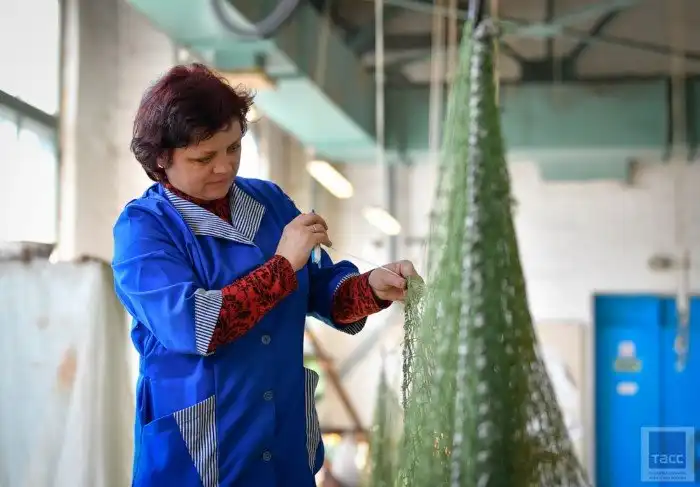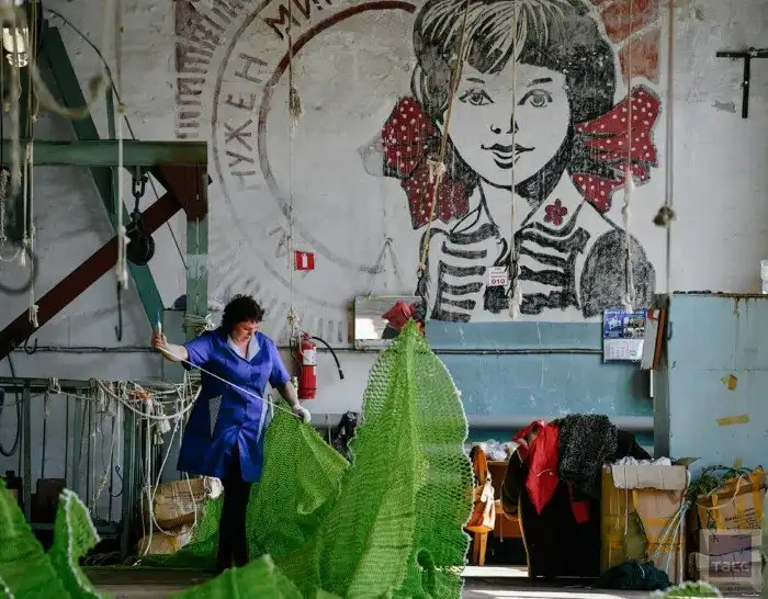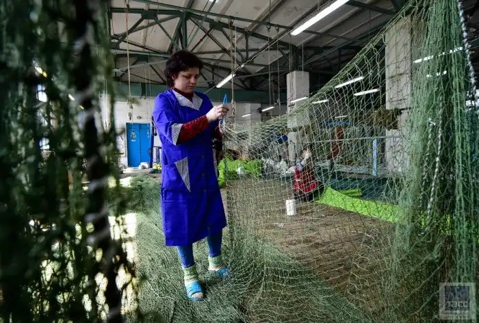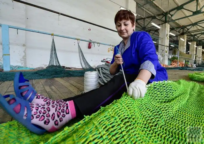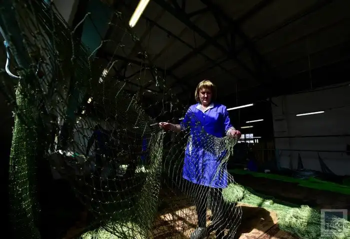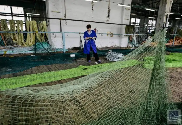 Сотрудница ООО «Приморское Сетевязальное Производство» в сетепошивочном цехе на фабрике орудий лова.