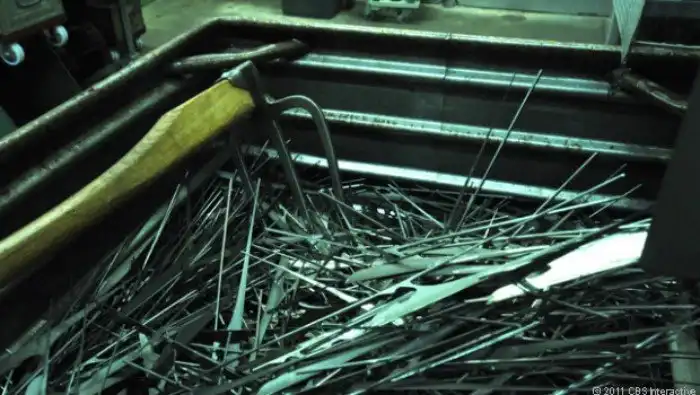 Заготовки лезвий укладываются на конвейер. Они отправятся в печь, где они подвергнутся воздействию температуры в 1050 градусов для того, чтобы закалить нержавеющую сталь. Это увеличит срок их эксплуатации на десятилетия.