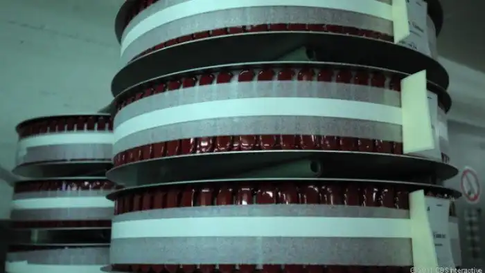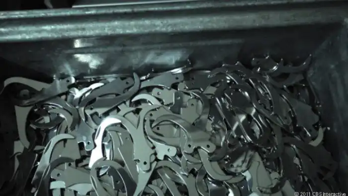 После выхода из штамповочной машины, специальный аппарат встряхивает контейнер с лезвиями, чтобы отвалились лишние кусочки металла, которые могли остаться после штамповки.