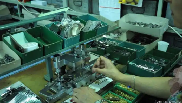 Рабочая проверяет каждую деталь швейцарского армейского ножа. Она использует ткань, чтобы не поранить руки, и инструмент помогающий тестировать каждый нож и все входящие в его состав детали.