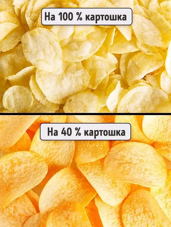 Секрет ровных, одинаковых чипсов в том, что они только на 40 % состоят из картофельных хлопьев, остальные 60 — это крахмал, мука и вода. При изготовлении этих чипсов все ингредиенты перемешиваются и прессуются специальными автоматами. Традиционный вариант — это тонко нарезанные картофельные слайсы, поджаренные в масле, их можно узнать по неровным краям и неоднородному цвету.