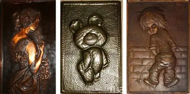Эти модные картины вычеканивались на медной пластинке специальными инструментами и вешались на стенку для обогащения интерьера.