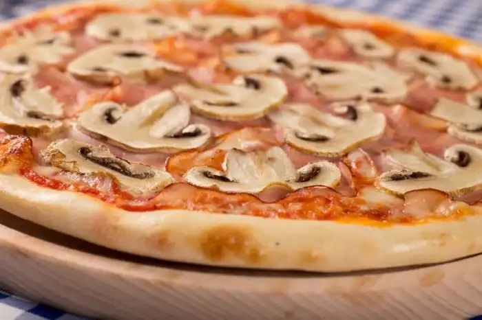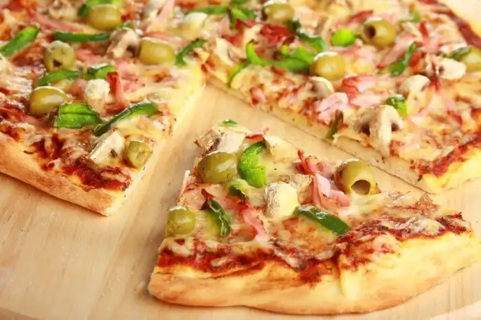 Инструкция: Сформируйте на сковороде или противне лепешку, смажьте кетчупом, посыпьте тертым сыром и выкладывайте слоями начинку до тех пор, пока все тесто не будет закрыто полностью. Сначала дольки помидоров, затем ветчину, шампиньоны (предварительно обжаренные на растительном масле до золотистого цвета с луком), маслины (разрежьте каждую на половинки и кладите срезом вниз, так они будут лучше смотреться), маринованные огурчики. Хорошо использовать специальные комбинированные приправы для пиццы (их выпускают самые различные фирмы), которыми можно посыпать ее сверху. Разогрейте духовку до 180 градусов и выпекайте пиццу 15-20 минут на сильном огне.