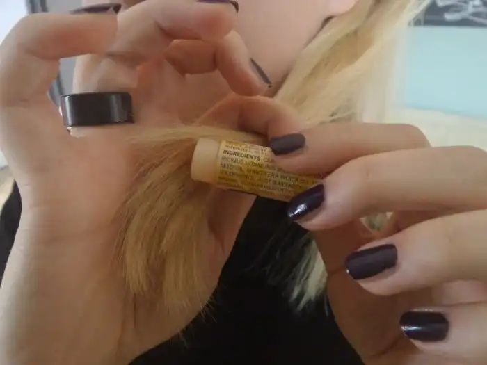 Если слишком сухие волосы начинают сечься, нанесите гигиеническую помаду на пальцы и как следует поводите по кончикам волос. После этого сеченые концы перестанут бросаться в глаза.