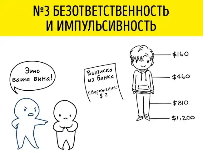 Психопаты чаще всего непоследовательны в своих поступках. Они превыше всего ставят свои желания. А ответственность за их финансовые промахи и опрометчивость вы никогда не сможете возложить на них. Они тут же обвинят собеседника в своих собственных ошибках, чтобы вывести его из душевного равновесия.
