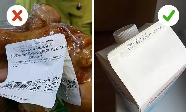 Если этикетки наклеены в 2–3 слоя, насторожитесь, — возможно, товар просрочен. Лучше покупать товар, где срок годности обозначен производителем. Также внимательно смотрите, что за дата указана на стикере, — дата фасовки товара не означает, что он свежий, это определяется датой срока годности.