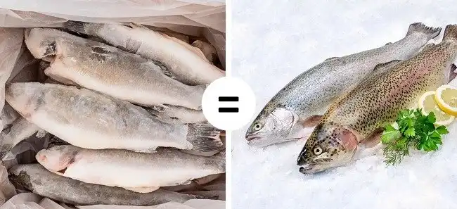 Мясо и рыбу часто размораживают и продают как охлажденные. Если продукты были заморожены единожды и размораживались по правилам, ничего страшного. Но иногда разморозка происходит при комнатной температуре, отчего в образующейся жидкости размножаются разные микроорганизмы, а верхний слой начинает портиться, когда внутри еще остается лед.