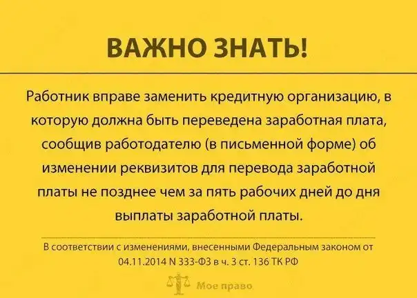 Также, если работник не желает получать зарплату в безналичной форме, то соответствующее условие трудового договора не должно применяться, поскольку оно ущемляет права работника и снижает уровень гарантий ему. Более того, чтобы работник получал зарплату через кредитную организацию, необходимо соблюдение двух условий. Во-первых, работник должен выразить свое желание в соответствующем заявлении, а во-вторых, условия выплаты зарплаты через кредитную организацию работодателю необходимо прописать в коллективном или в трудовом договоре (ч. 3 ст. 136 ТК РФ).