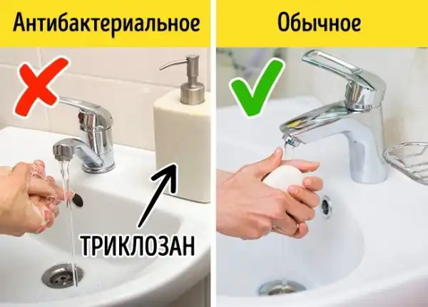 На самом деле нет научных подтверждений, что антибактериальное мыло эффективнее обычного мыла и воды. В ряде исследований результаты показали, что триклозан, который активно используется при производстве большинства зубных паст, дезодорантов и жидкого антибактериального мыла, крайне вреден для организма.