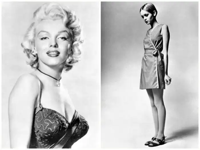 Сначала на экранах блистали фигуристые актрисы вроде Мэрилин Монро, потом в моду вошли мальчишеские фигуры, как у хрупкой манекенщицы 60-х Твигги. В целом середина прошлого века была нестабильной в плане моды: в нем параллельно существовала мода на маленькую грудь и на пышные формы.