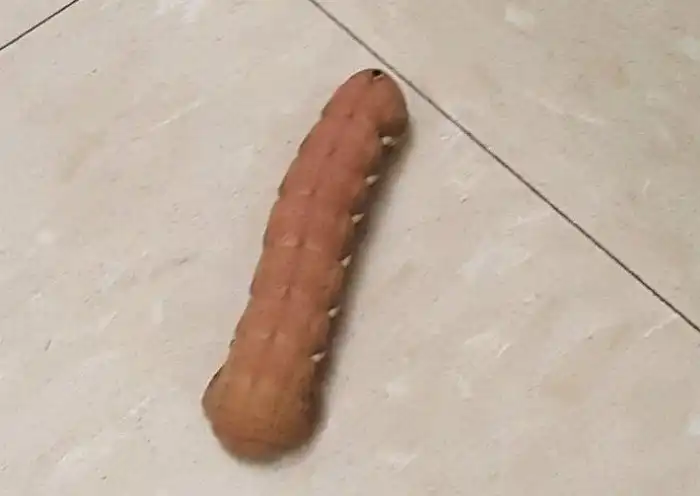 "Это гусеница бражника (насекомое отряда чешуекрылых, похожее на мотылька). Она уже большая, и скорее всего, совсем скоро окуклится".