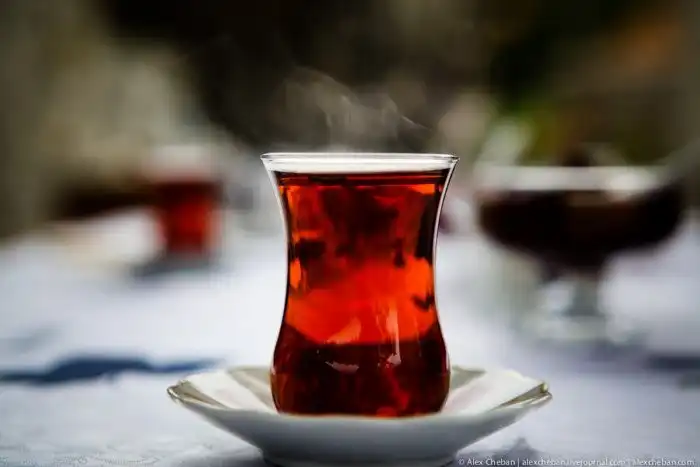 Чай пьют из стакана, типичного для этого региона – армуды (армуд – груша), чай не остывает, а края не горячие, очень удобно! Причем объем армуды достаточный в отличии от Турции, где он несколько маловат. Чай пьют в основном черный, иногда с добавление трав или чисто травяной. Зеленый чай – не очень популярен, скорее пришел в последнее время как модный тренд. Чай, естественно, без сахара. С чаем всегда на столе обилие сладостей: