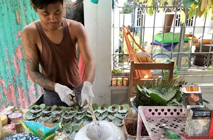 Одно из излюбленных занятий бирманцев — жевать бетель. Купить этот орех, завернутый вместе с табаком в лист и смазанный меловым раствором, можно за копейки на любом углу. Причем сами углы зачастую полностью заплеваны красной слюной, которая обильно вырабатывается в процессе потребления этого продукта. Часто можно даже встретить таксистов, которые возят с собой в машине пластиковую бутылку, куда они сплевывают красную слюну — зрелище не самое приятное.