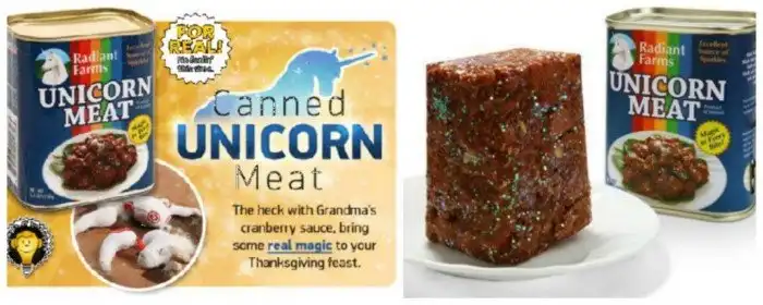 Ну это тот вариант, когда некоторые говорят: «Я его слепила из того, что было…», и пусть это выражение про мужчин, но вот под мясо единорога оно тоже вполне себе отлично подходит. Неизвестно, из чего вообще это сделано, и каково оно на вкус, но факт остается фактом, кто-то реально это производит и продает. Учитывая то, что на банке написано, что это мясо, то крайне странно есть мясо с блестками. В итоге мы имеем мясо непонятного кого или чего и совершенно несъедобные блестки. Хочется просто попросить производителя сего чуда откупорить банку и самому съесть ее содержимое. Интересно, сподвигнется ли он или нет? Как вы думаете? Итак, цена: на Amazon вы можете купить мясо единорога с блестками за 12,99 долларов.