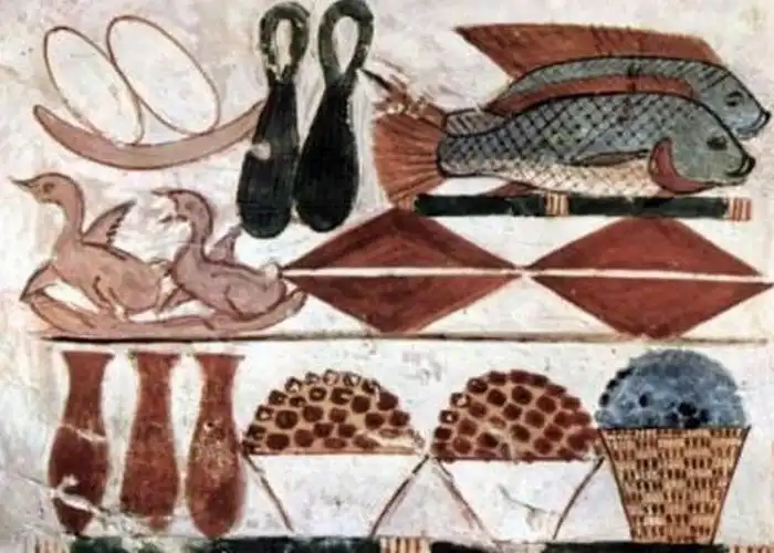 О кулинарных рецептах древних египтян, вероятно, уже никто и никогда не узнает. Не было найдено никаких записей, но узнать о том, чем питались египтяне, можно из произведений искусства того времени. Некоторые ингредиенты употреблялись всеми классами, но ряд продуктов простолюдинам был запрещены. К примеру, копчение рыбы было строго уделом жрецов. Зато ежедневной пищей всех слоёв общества было пиво и хлеб.