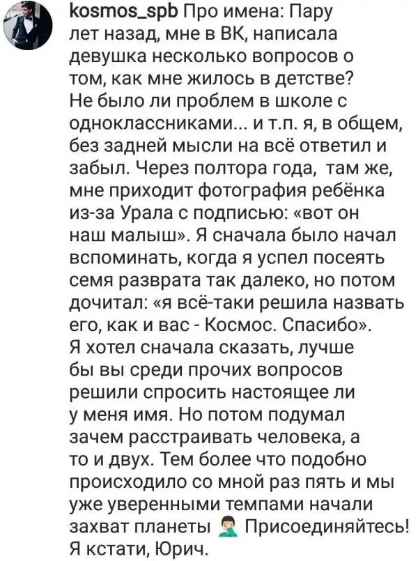 Сегодня в Россию возвращается мода на привычные имена, Иван, Мария, Любовь, Владимир. Но отдельные люди по-прежнему изощряются при выборе имени для малыша. Только теперь это не Индустриализация, Интернационал или Энергия, а малопонятные придуманные конструкции, или имена кумиров, актеров и певцов, а также понравившиеся имена из фильмов, книг, комиксов.