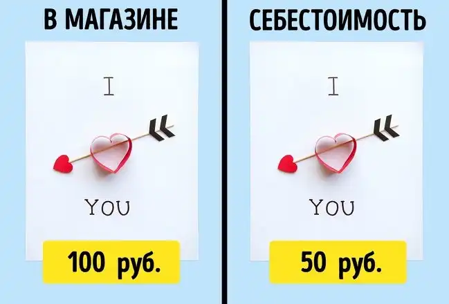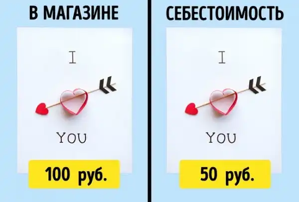 Обычно наценка поздравительной открытки составляет 50‒100 %. Несмотря на эру цифровых сообщений, они все еще остаются популярными: ежегодно только в США покупают 7 млрд экземпляров.