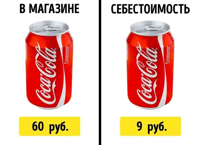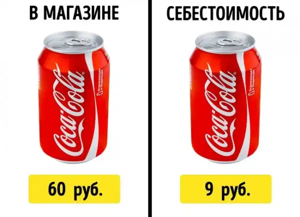 Затраты на производство одной банки кока-колы объемом 355 мл составляют $ 0,16 (9,02 рубля). Цена в магазине может доходить до 110 рублей. То есть к тому времени, как банка попадет на прилавок, ее цена может вырасти в 12,5 раза.