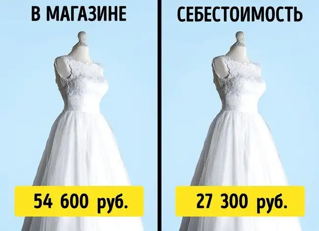 Цена на свадебное платье в среднем в 3,9 раза выше похожего белого платья, которое не считается свадебным. Размер наценки варьируется в зависимости от бренда и продавца — от 100 до 600 %.