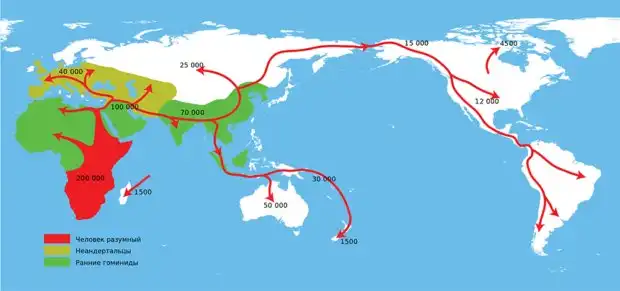 Доподлинно известно, что предки человека совершили несколько очень крупных миграций, растянутых по времени на тысячи лет. Homo Erectus осуществили первый большой поход из Африки и в Восточную Азию уже 1,8 миллионов лет назад. Примерно через миллион лет предшественники неандертальцев появились в Европе, а 125 тысяч лет назад Homo Sapiens заселили области современного Ближнего Востока. Изменения климата и перенаселённость являются одними из наиболее распространенных гипотетических причин, которые заставили наших предков постоянно мигрировать, однако истинных мотивов данных перемещений мы, вероятно, уже никогда не узнаем.