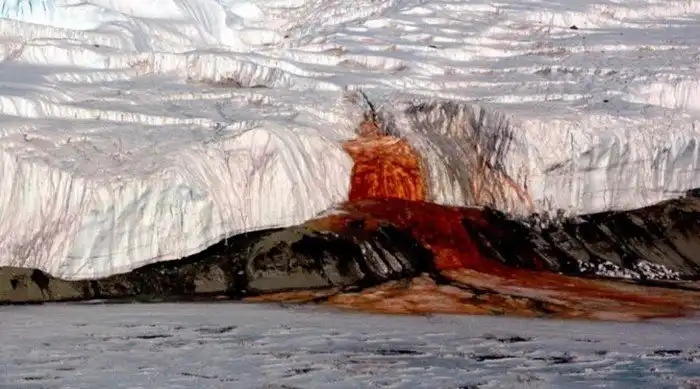 Поток кроваво-красной жидкости бьет из ледника Тейлора. На самом деле, никакой крови тут конечно нет, а необычный цвет воде обеспечивает высокое содержание меди. Источником воды является озеро за несколько километров от водопада, полностью покрытое льдом.