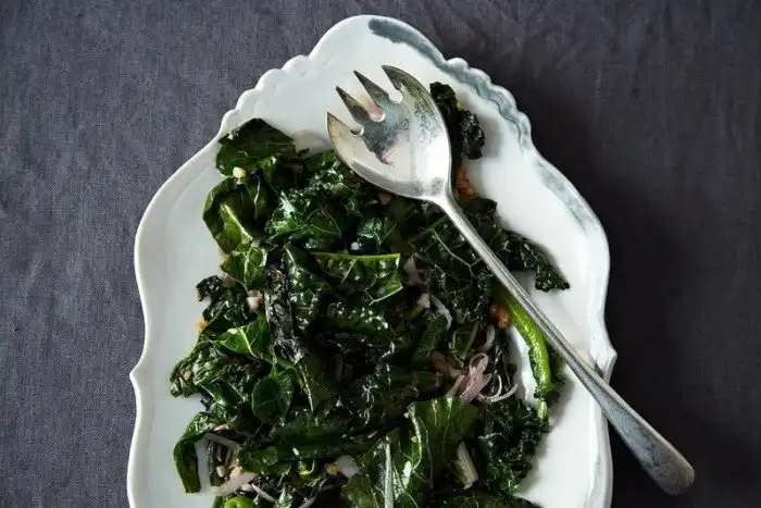 Тщательно вымойте зелень — выберите то, что вам нравится. В этом рецепте используются кудрявая капуста, листья горчицы, мангольд. Разогрейте сковороду, добавьте растительное масло, нарезанный ломтиками лук, мелко нарезанный чеснок и жарьте, пока лук не станет мягким. Затем начинайте добавлять зелень, и, чтобы ускорить процесс готовки, можно добавить немного воды. Когда зелень приготовится, украсьте блюдо орехами, сбрызните лимонным соком и подавайте.