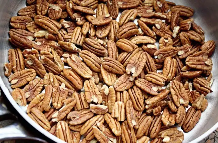 Плоды пекана в скорлупе схожи с маслинами, за что орех получил свое второе название «оливковый орех». Без скорлупы пекан напоминает грецкий орех — с ним он схож формой и вкусом. На 70% пекан состоит из жиров, поэтому его рекомендуется есть отдельно от жирных продуктов и только в небольших количествах. Орех содержит множество питательных и полезных веществ, в том числе одну из разновидностей витамина Е, которая может сдерживать рост раковых клеток. Пекан особенно полезен при авитаминозе, усталости, малокровии и отсутствии аппетита.