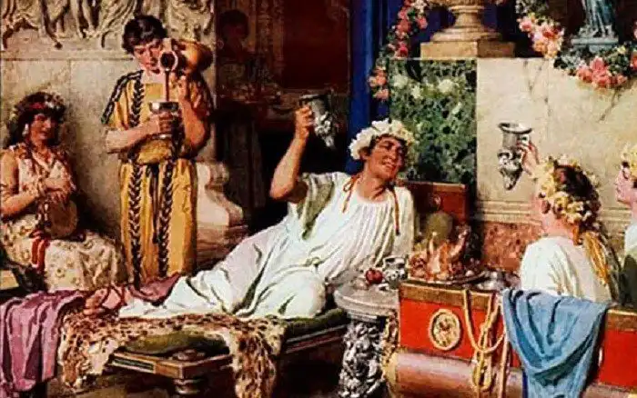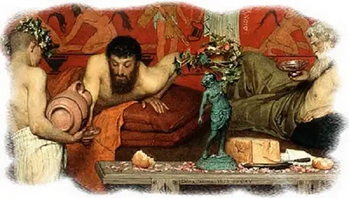 В назначенное время появлялись небольшие столики с закусками и вином. Для удобства столики были ниже лежаков. Рабы и слуги выносили гостям в специальном сосуде воду для омовения рук, и после этого начинался пир.