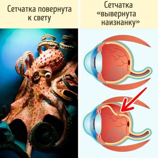 Как было бы лучше? У многих представителей животного мира структура глаза устроена иначе. К примеру, в сетчатке кальмаров и осьминогов фоторецепторные клетки повернуты к источнику света, что делает устройство их глаз куда «логичнее», чем у человека. Так что стоит взять с них пример — просто перевернуть сетчатку.