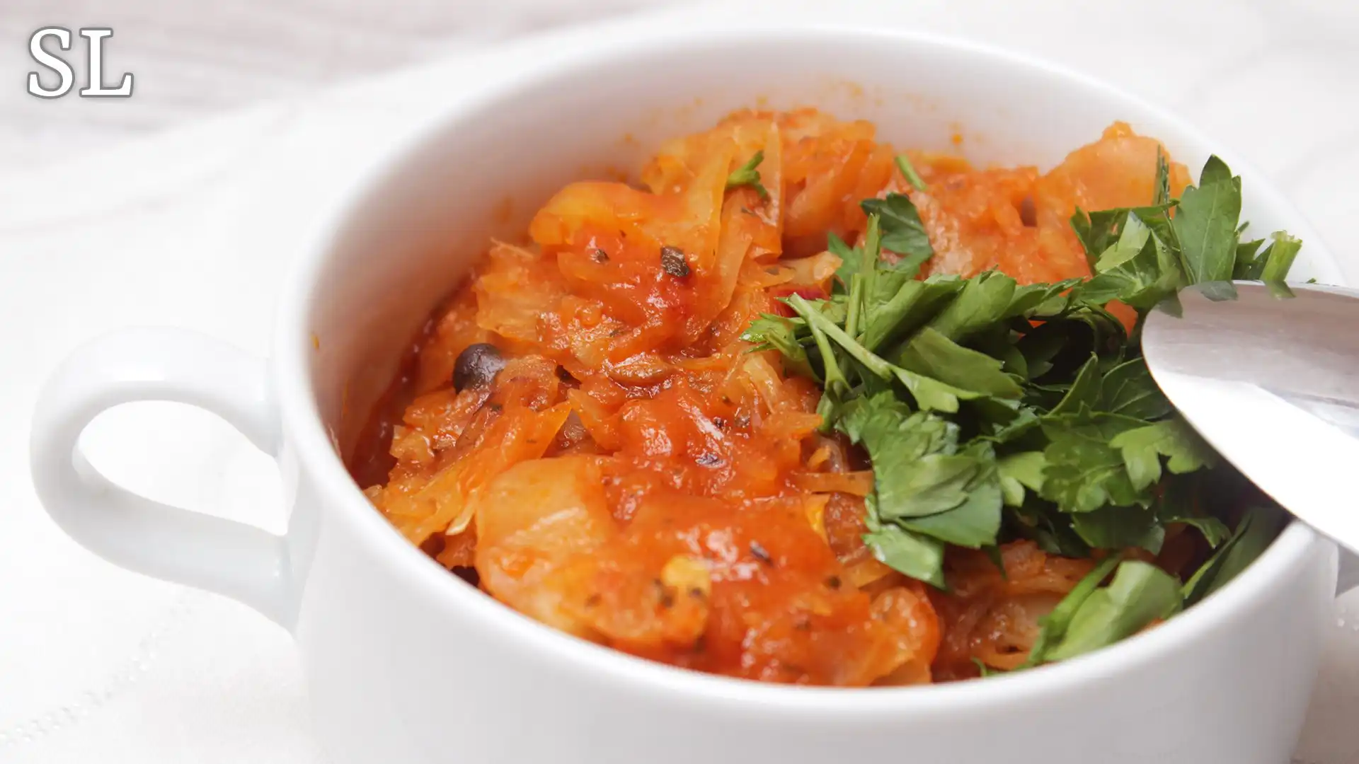 Как только свежая капуста станет мягкой, добавьте в нее беконно-грибную смесь и несколько ложек томатной пасты. Блюдо хорошо перемешайте и тушите еще минут 10.