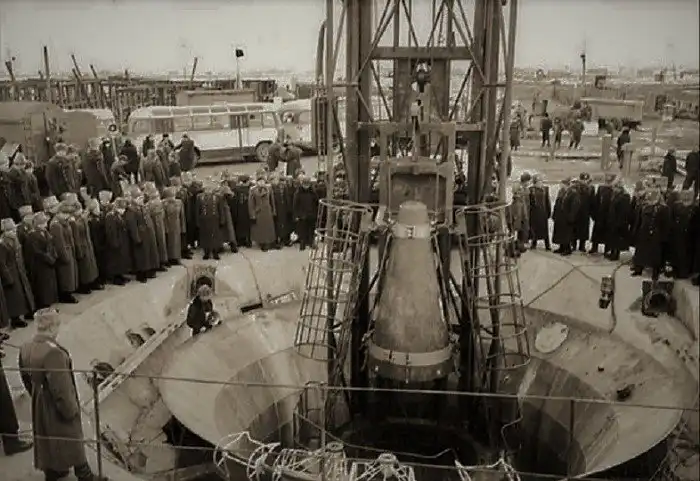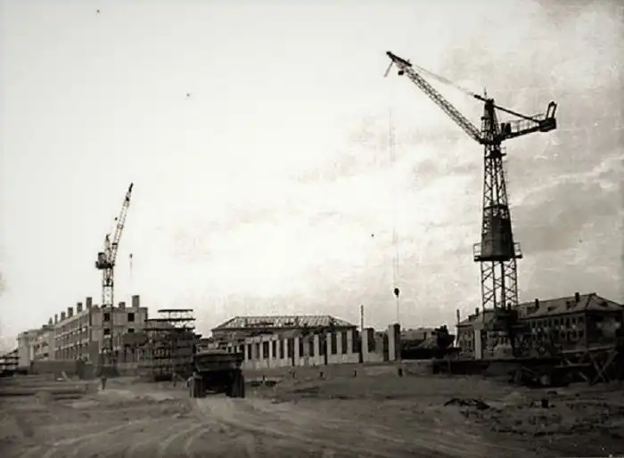 12 февраля 1955 года выбор площадки под полигон в Казахстане был закреплен в постановлении Совета министров СССР, хотя первый отряд военных строителей высадился на станции Тюратам месяцем ранее. В конце этого года на сооружении объекта, получившего кодовое название «Стадион», работало уже 2,5 тыс. военных и вольнонаемных рабочих и до 20 тыс. «стройбатовцев».