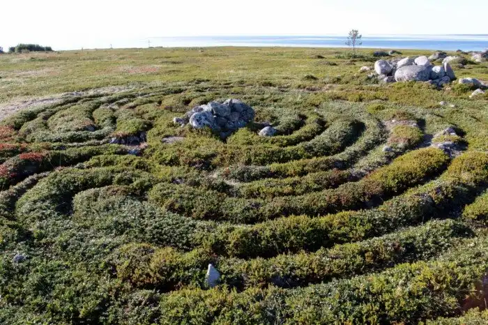 «Северные лабиринты» – это спиралевидные фигуры, которые представляют собой разнообразные системы ходов, выложенных из валунных камней небольшого размера. Размеры валунов варьируют в диаметре от 3,40 до 24, 40 м, их высота не превышает 50 см.