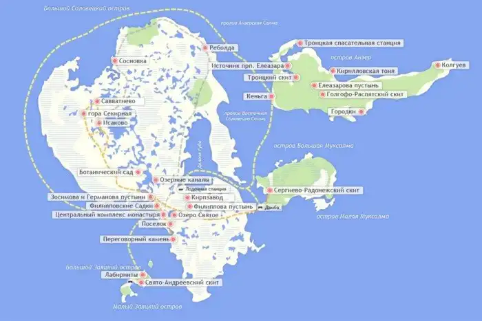 Соловецкое скопление лабиринтов раскидано по островам архипелага, но самая значительная часть сосредоточена на острове, называемом Большой Заяцкий, который находится на юго-западе архипелага, его площадь составляет лишь 1,5 квадратных километра.