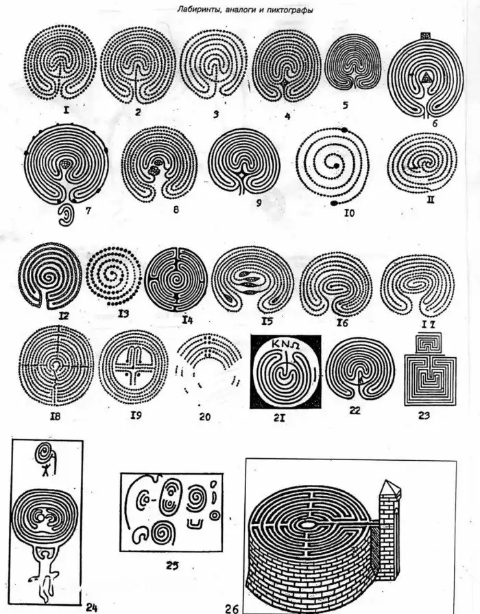 …построенные, согласно представлениям древних, на границе двух миров — «среднего» и «нижнего» — лабиринты, скорее всего, символизировали либо собственно нижний — потусторонний — мир, населенный мертвыми и враждебными человеку духами, либо запутанный путь в него. Одна функция лабиринта состояла, таким образом, в том, чтобы обеспечить перемещение в нижний мир душ умерших и погребенных по обряду, предусматривавшему трупосожжение.