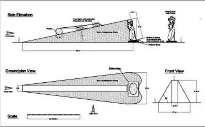 А вот шляпы попадали к истуканам готовыми не полностью. От каменоломни, где делались заготовки пукао, их просто катили, что подтверждается царапинами на поверхности. Уже возле истукана, для которого шляпа предназначалась, заготовку дорабатывали и, используя весьма простой способ, надевали на каменного владельца.