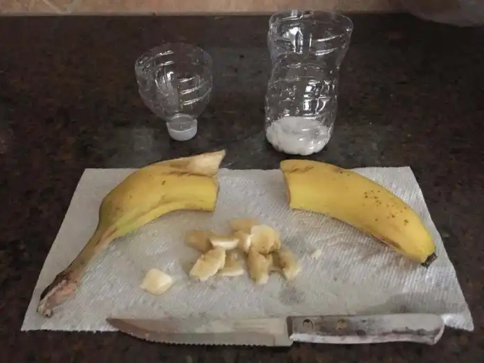Итак, для сооружения ловушки нам понадобятся: пустая пластиковая бутылка, ножницы, нож, сахар, вода, банан