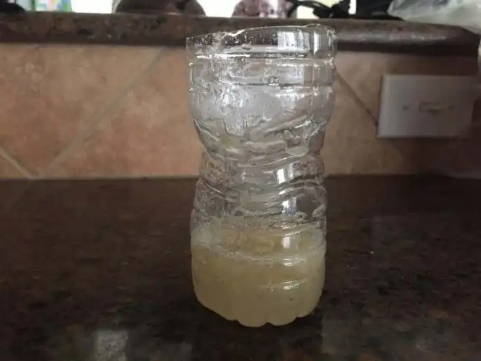 Туда же налейте совсем чуть-чуть воды, чтобы она смогла полностью утопить содержимое части бутылки. Не забудьте всё это дело довести до пюреобразного состояния и помешать с помощью ножа
