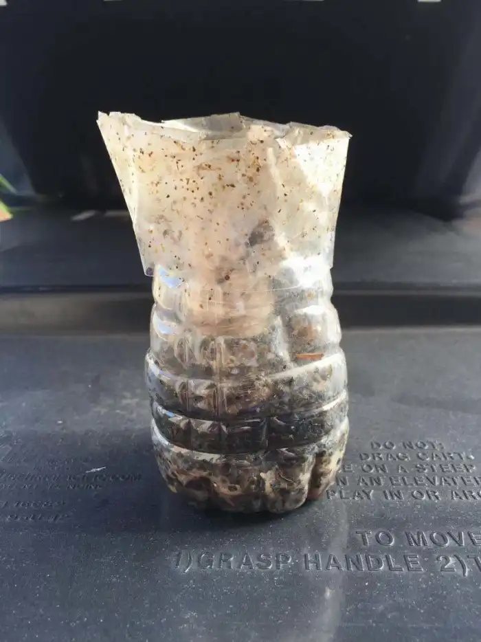 Потом горлышком вниз положите верхнюю часть бутылки (без крышки) в нижнюю (смотрите фото)