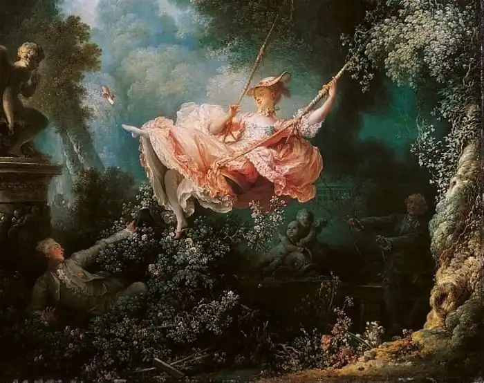 Эта знаменитая картина эпохи рококо даже была показана в «Холодном сердце» Диснея. Тем не менее, Фрагонар явно вкладывал в свою работу более глубокий смысл, чем Дисней. На картине изображена молодая женщина, которую раскачивает на качелях в романтическом саду пожилой мужчина. Этот мужчина явно не подозревает о присутствии молодого любовника девушки, который наблюдает за ними из кустов.