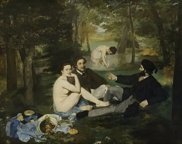 Женская нагота довольно часто встречалась в классическом искусстве. Но даже в то время, когда рискованные художники осмеливались рисовать женщин во всей их обнаженной красе, работа Мане выделялась среди остальных. На этом шедевре импрессионизма изображен пикник двух полностью одетых мужчин с обнаженной женщиной, смотрящей на зрителя (а на заднем плане есть еще одна полностью одетая женщина). Изображение было уникальным в этом отношении, поскольку вплоть до того момента обнаженными, как правило, изображали богинь, таких как Венера или Афродита.