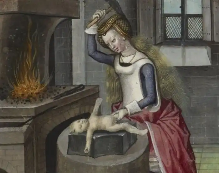 Об этой картине, которая была иллюстрацией к поэме XIII века Гильома де Лорриса и Жана де Мена, известно мало что. Это привело к тому, что изображение часто демонстрируется вне контекста. На картине ясно показана женщина, бьющая ребенка молотком, а в стороне лежат несколько серых, явно мертвых младенцев. Однако, как видно из названия, женщина не является убийцей ребенка. Она на самом деле является аллегорическим изображением Матери-Природы, которая «кует» своих детей.