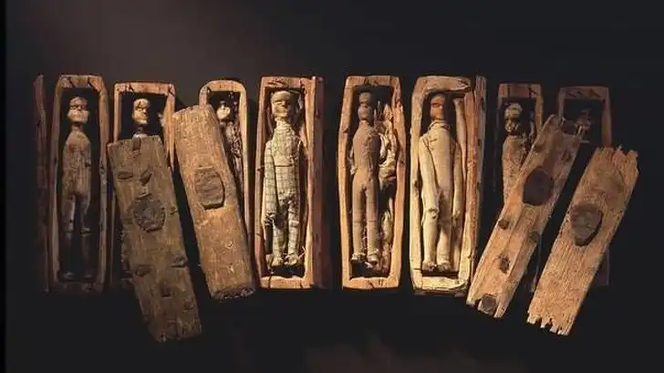 17 маленьких гробиков было обнаружено в пещере на холме Трон Артура в 1836 году. У всех были съемные крышки, а внутри каждого лежала деревянная кукла в мужской одежде. Специалисты выдвинули 2 теории. Согласно первой, гробики могли использоваться в ритуалах вуду. А вот вторая, более популярная теория предлагает представить, что гробики — это своеобразный счетчик жертв серийного убийцы. На сегодняшний день установлено лишь, что гробики были сделаны в разное время между 1812 и 1820 годами, но загадка их происхождения все еще не разгадана.