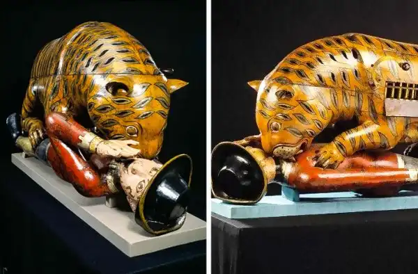 Знаменитая игрушка представляет собой тигра, терзающего британского солдата. Фигуры выполнены почти в натуральную величину, а механизмы внутри деревянных тел имитируют звуки воплей изо рта человека и рычание из тигриной пасти. Игрушка была сделана для индийского правителя Типу Султана, который всей душой ненавидел британцев.