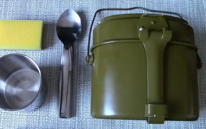Котелки для варки пищи были в основном армейские. Удобным было то, что используя сам котелок для варки супов, его крышку в тоже время можно было приспособить в качестве сковороды. В общем и целом, это была незаменимая вещь для походов, даже на короткий срок.